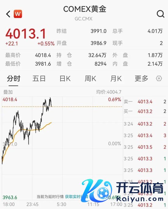 纽约期金价钱报4013.1好意思元/盎司,日内涨0.55%。