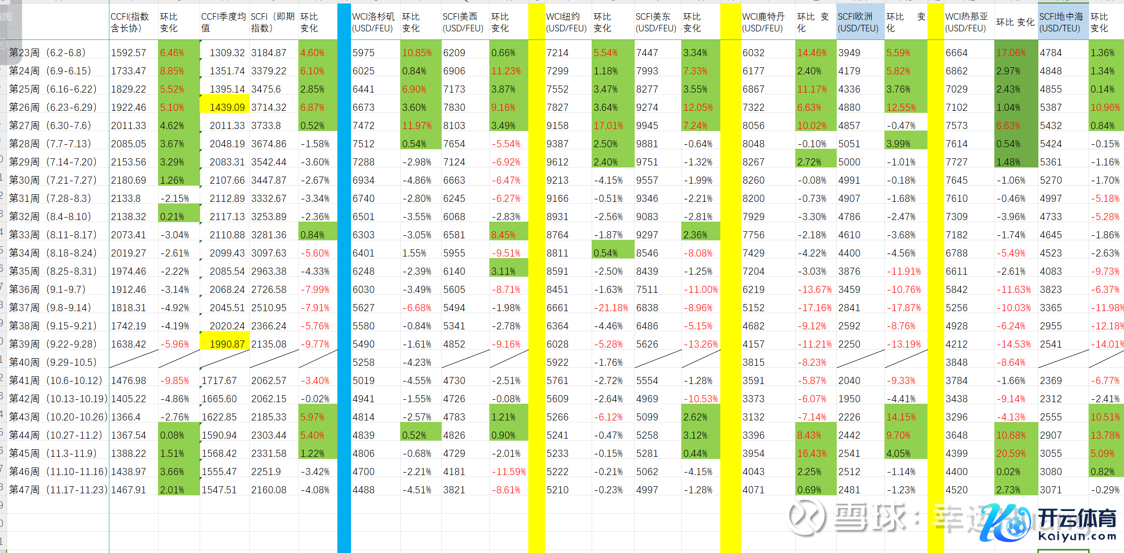 (原标题:德鲁里停航数据及运价和好意思西口岸追踪week47(绕行数据更新)) 一、运价追踪 德鲁里WCI玄虚指数下落1%,至3413好意思元/月,比2021年9月的疫情峰值10377好意思元低67%,但比2019年(疫情之前)的平均水平1420好意思元逾越140%。 本期CCFI持续高涨2.01%至1467.91,SCFI本周下落4.08%至2160.08. 欧地航路:市集货量减少,舱位供大于需,运价捏续下落。 北好意思航路:促销季备货实现,市集出货随之减少,好意思西航路舱位充足运价跌幅较大