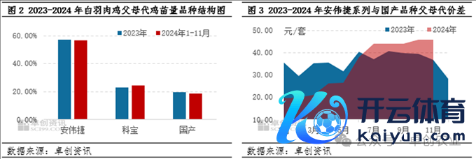 其次,2024年1-11月国居品种父母代鸡苗月度更新量同比减少,且占比着落。据卓创资讯数据统计,2023年国居品种父母代鸡苗月度更新量占比可达19.67%,但2024年1-11月其占比降至18.82%,同期更新量较2023年1-11月减少2.98%,因此国内父母代种鸡企业对国居品种父母代鸡苗认同度镌汰。玄虚国居品种父母代鸡苗成交价钱及更新量来看,2024年其施行成果不足预期,企业将要点由增量向提质滚动,贪图2025年祖代种鸡更新量较2024年略降。