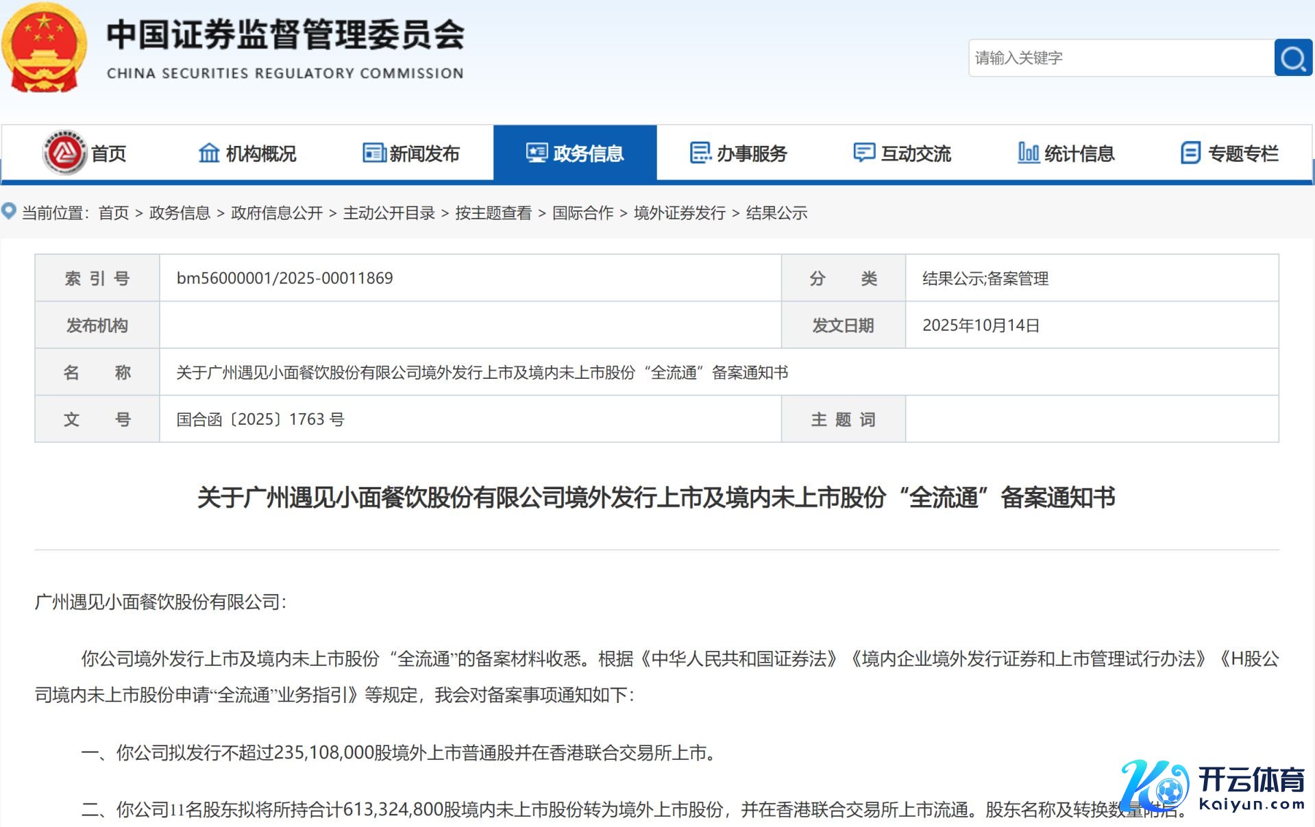 10月14日,中国证监会官网败露《对于广州碰见小面餐饮股份有限公司境外刊行上市及境内未上市股份“全流畅”备案告知书》。笔据备案告知书,碰见小面拟刊行不独特2.35亿股境外上市无为股并在香港持续往返所上市。同期,其11名推动拟将所握共计6.13亿股境内未上市股份转为境外上市股份,一并赴港上市流畅。